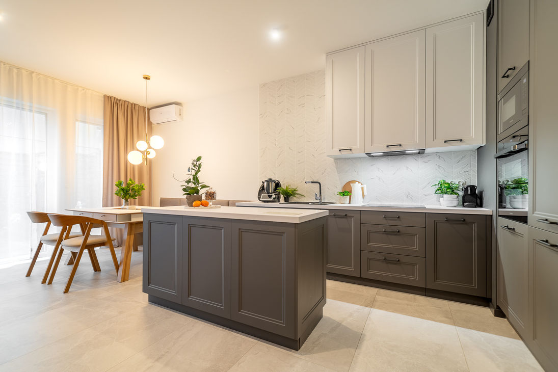 Kuchnia została wyposażona w meble wykonane na zamówienie, a także w niezbędny sprzęt AGD w zabudowie: lodówkę z zamrażalnikiem, zmywarkę, piekarnik, mikrofalówkę, płytę indukcyjną, pochłaniacz.