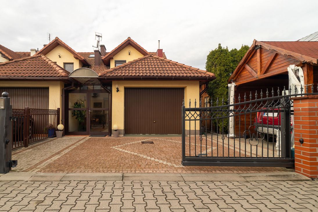 Bliźniak z 2003 r. z garażem w bryle budynku, na zamkniętym osiedlu w Kiełczowie.